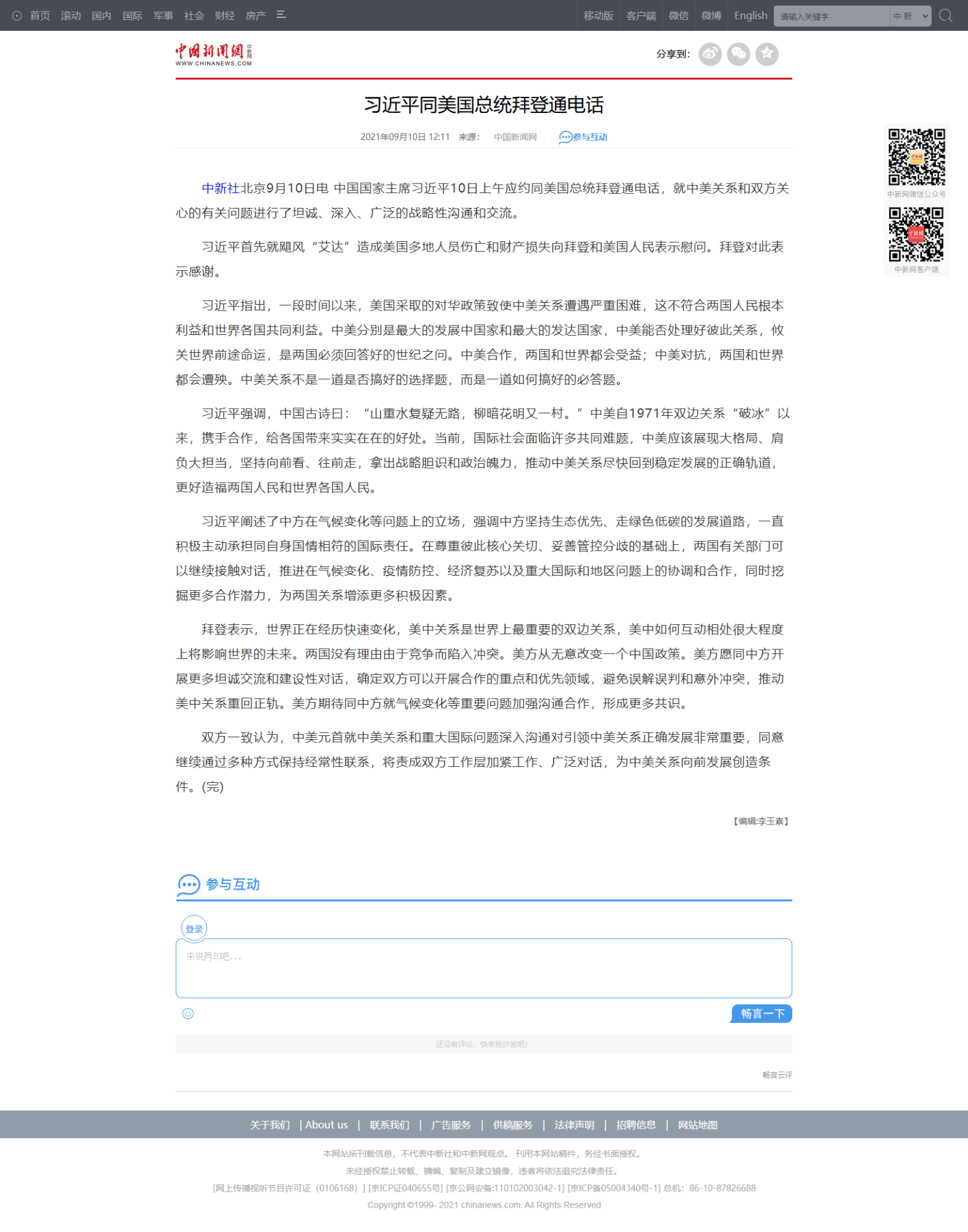 習(xí)近平同美國(guó)總統(tǒng)拜登通電話